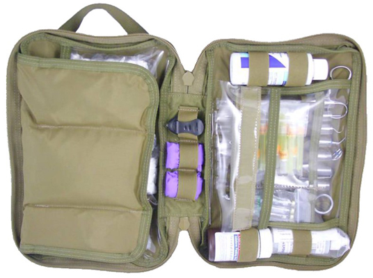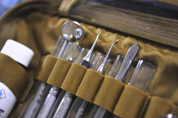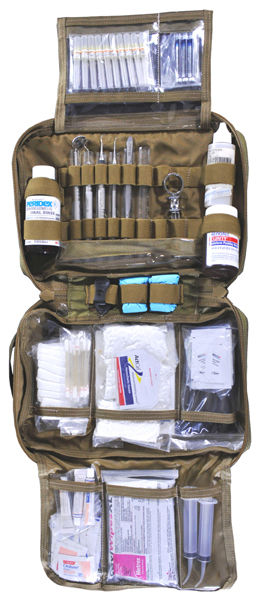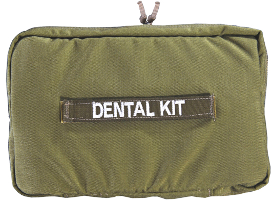 The JBC Emergency Dental Kit was designed specifically for treating minor dental emergencies in the field by trained corpsman and medics. The compact bag zips open flat to access two fold over panels containing supplies and instruments selected by a Navy Dentist. The bag is a fold-out design constructed of 1000 Denier Cordura® with a double zipper. The clear vinyl internal pockets allow for quick identification of instruments and supplies.